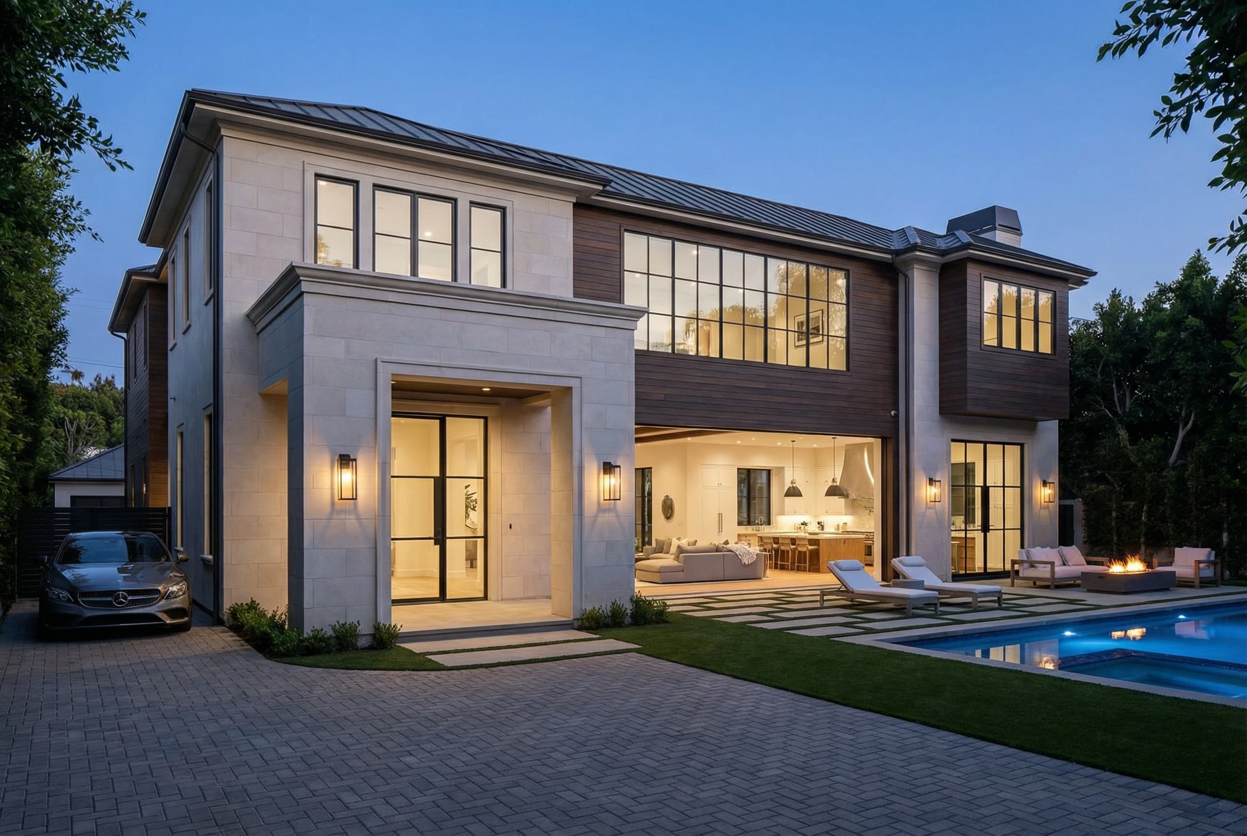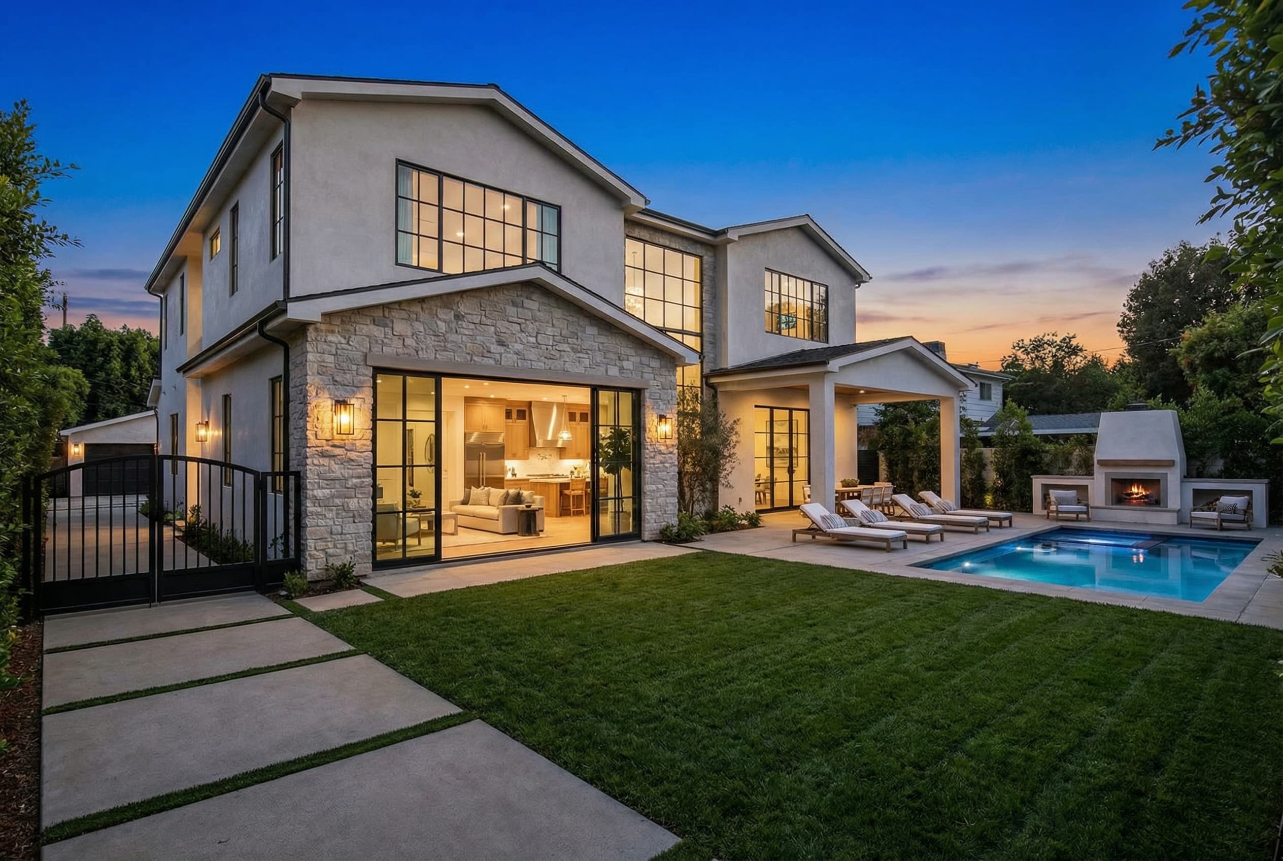 Project Scope: Custom new construction, architectural planning, permit coordination, structural engineering, open-concept layout development, gourmet kitchen, spa-inspired bathrooms, custom millwork, integrated lighting, pool and outdoor entertainment area, luxury interior finishes
