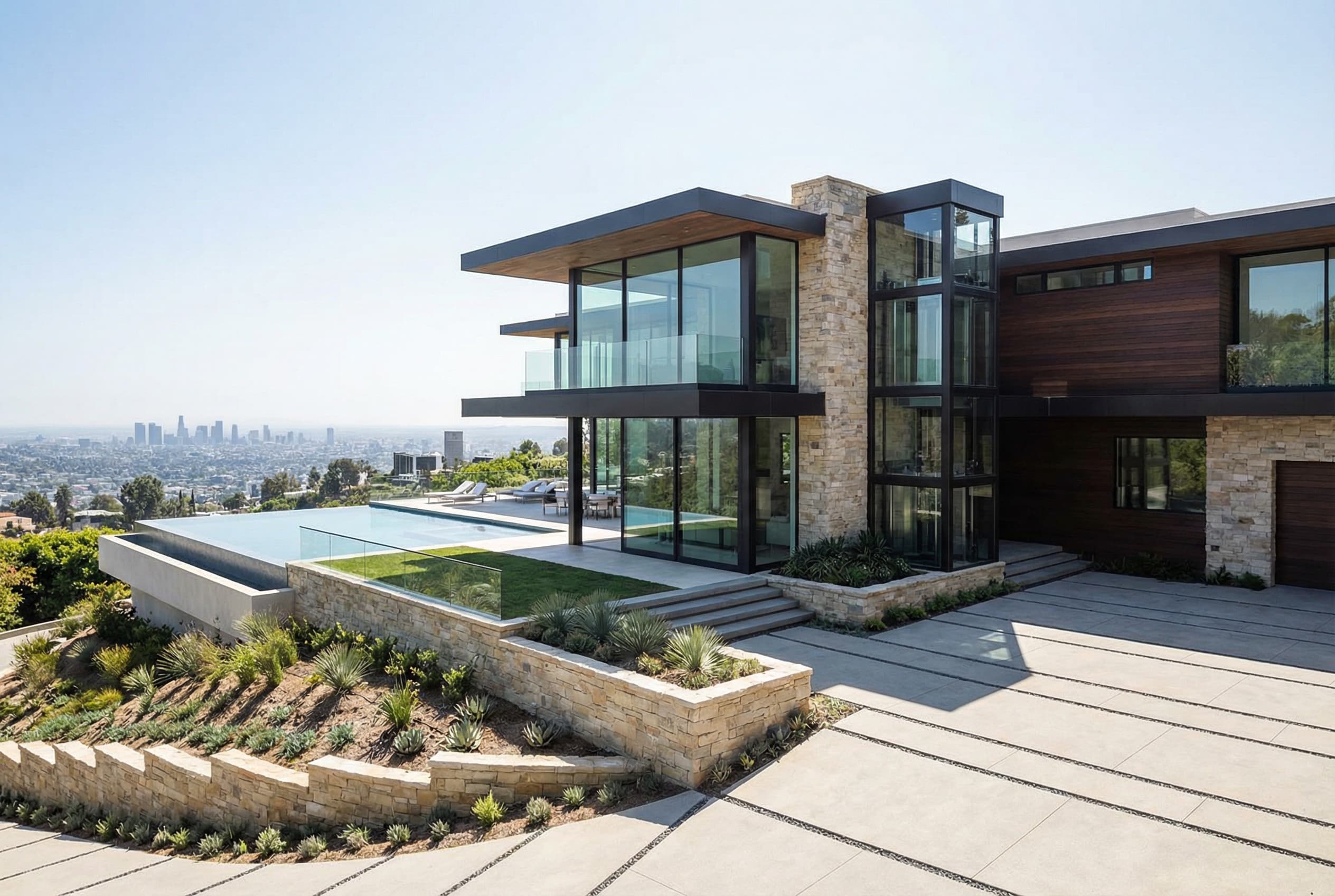 Project Scope: Ground-up luxury home construction, site planning, hillside engineering, retaining walls, structural coordination, custom floor plan development, expansive glazing, elevator integration, high-end kitchen and bath build-out, smart-home infrastructure, premium exterior finishes